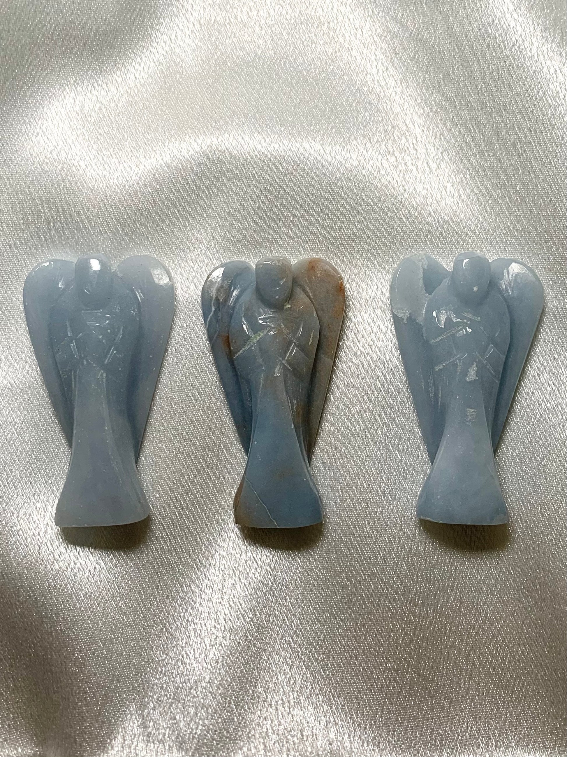 Each carving is about 2 inches long. These are natural crystals, therefore no two will look the exact same. Angelite is a rather soft crystal, so it is best to prevent getting it wet.